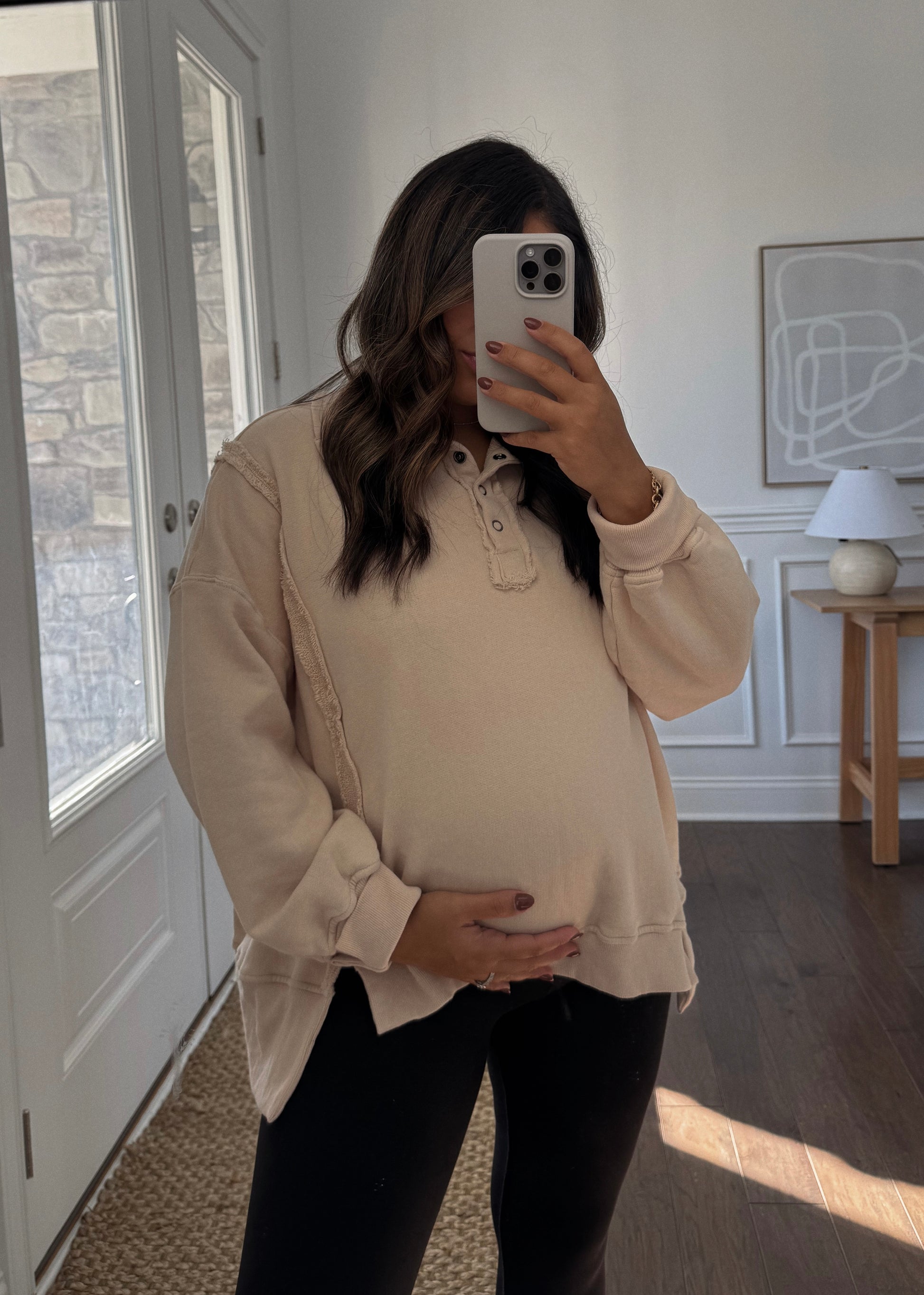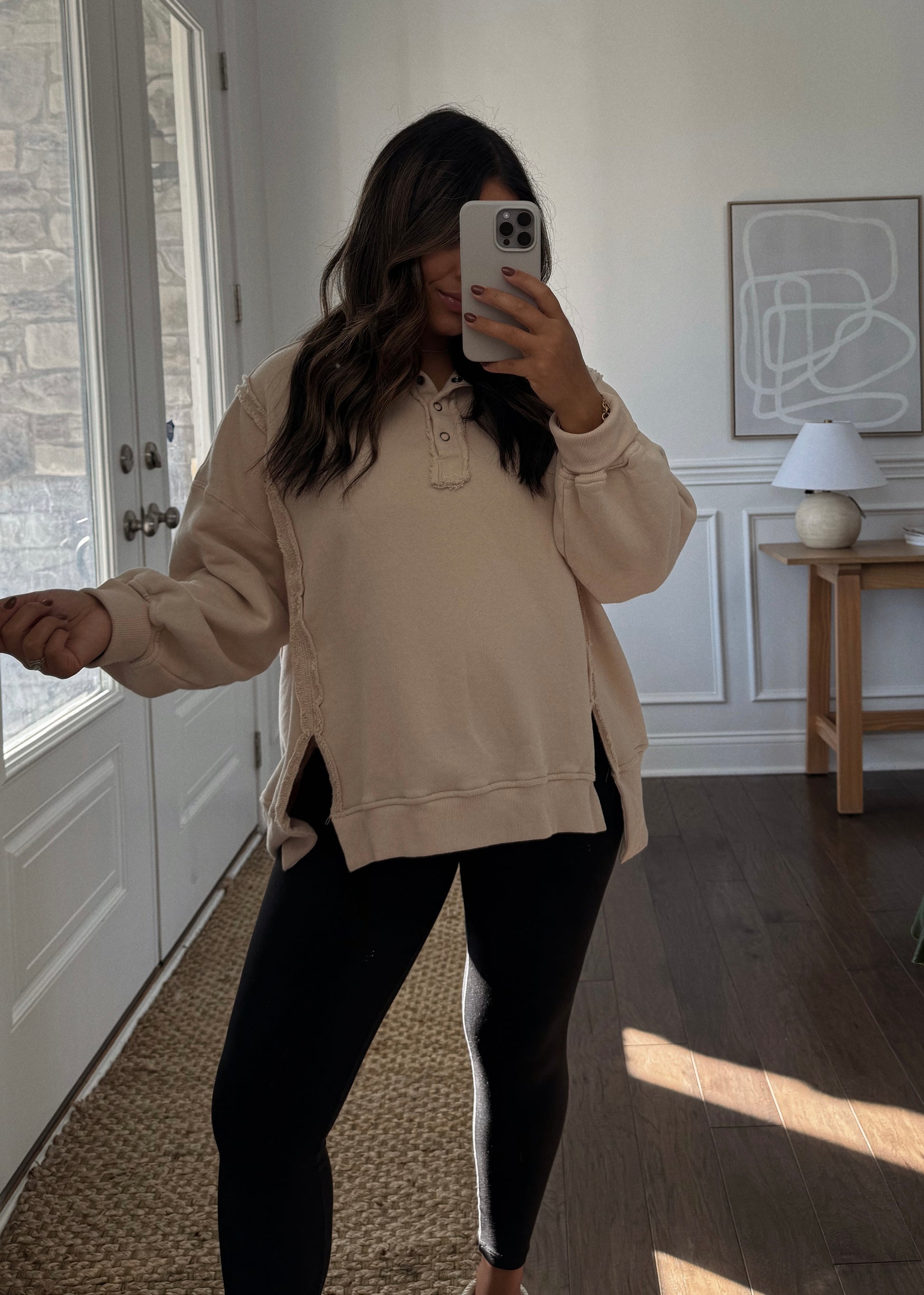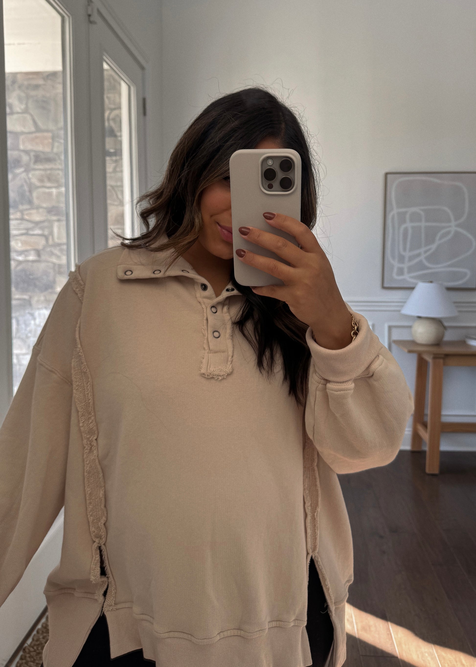 Expertly crafted with French terry fabric and raw seam detailing, our Vintage Washed Terry Pullover offers an oversized, relaxed fit for ultimate comfort. Stay stylish and cozy in this almond-colored pullover.