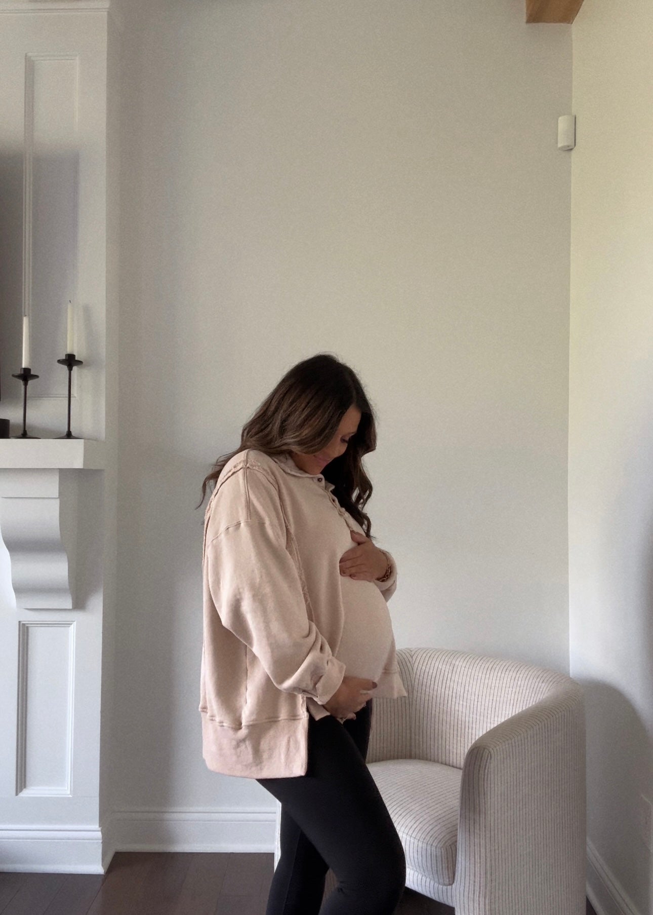 Model Details: The model currently weighs 168 pounds, is 27 weeks pregnant, stands 5'4", and is wearing her true size, which is a medium.
